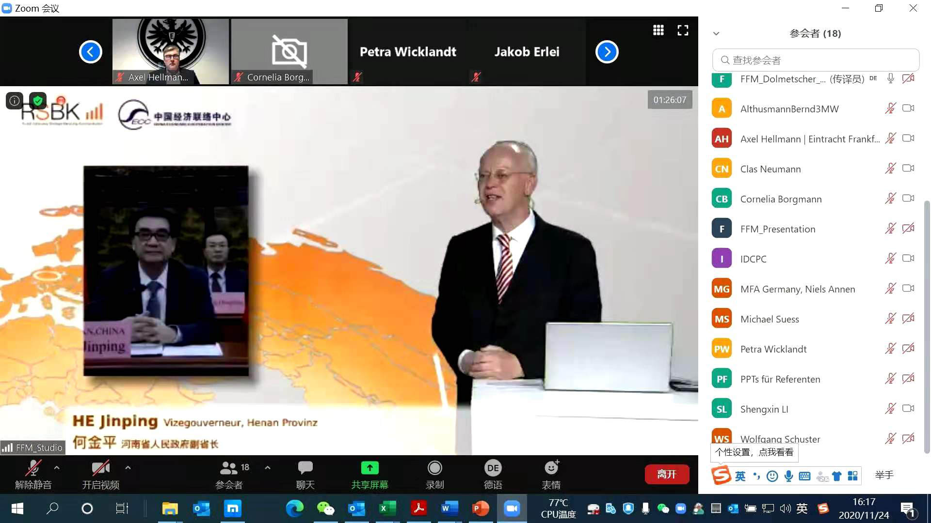 The meeting on November 24, which focuses on China-Germany relations after the end of Coronavirus outbreak, was an important one. He Jinping, The vice governor of Hennan Province and Zhao Shuhong, the vice mayor of Xuchang City both made remarks on the meeting. Mrs. Zhao introduced Xuchang’s leading industry, comprehensive strength and Xuchang’s cooperation with Lahn-Dill-Kreis. Wolfgang Schuster, mayor of Lahn-Dill-Kreis, expressed his gratitude for Xuchang’s medical donation and great support in April this year.