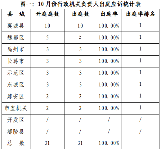 2023年10月,世界杯投注fifa官方网县两级法院开庭审理一审、二审行政案件共31件,出庭31件,行政机关负责人出庭应诉率为100%。上述数据中,一审行政案件开庭审理19件,出庭19件,行政机关负责人出庭应诉率为100%;二审行政案件开庭审理12件,出庭12件,行政机关负责人出庭应诉率为100%(见图一)。