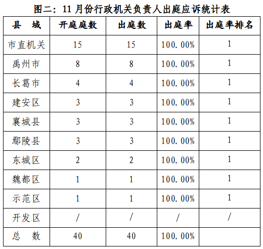 2023年11月,世界杯投注fifa官方网县两级法院开庭审理一审、二审行政案件共40件,出庭40件,行政机关负责人出庭应诉率为100%。上述数据中,一审行政案件开庭审理26件,出庭26件,行政机关负责人出庭应诉率为100%;二审行政案件开庭审理14件,出庭14件,行政机关负责人出庭应诉率为100%(见图二)。