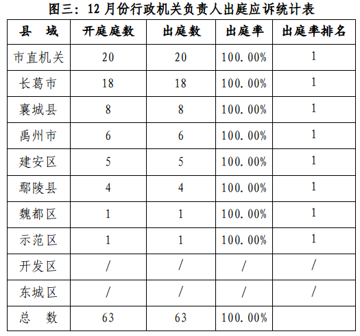 2023年12月,世界杯投注fifa官方网县两级法院开庭审理一审、二审行政案件共63件,出庭63件,行政机关负责人出庭应诉率为100%。上述数据中,一审行政案件开庭审理49件,出庭49件,行政机关负责人出庭应诉率为100%;二审行政案件开庭审理14件,出庭14件,行政机关负责人出庭应诉率为100%(见图三)。