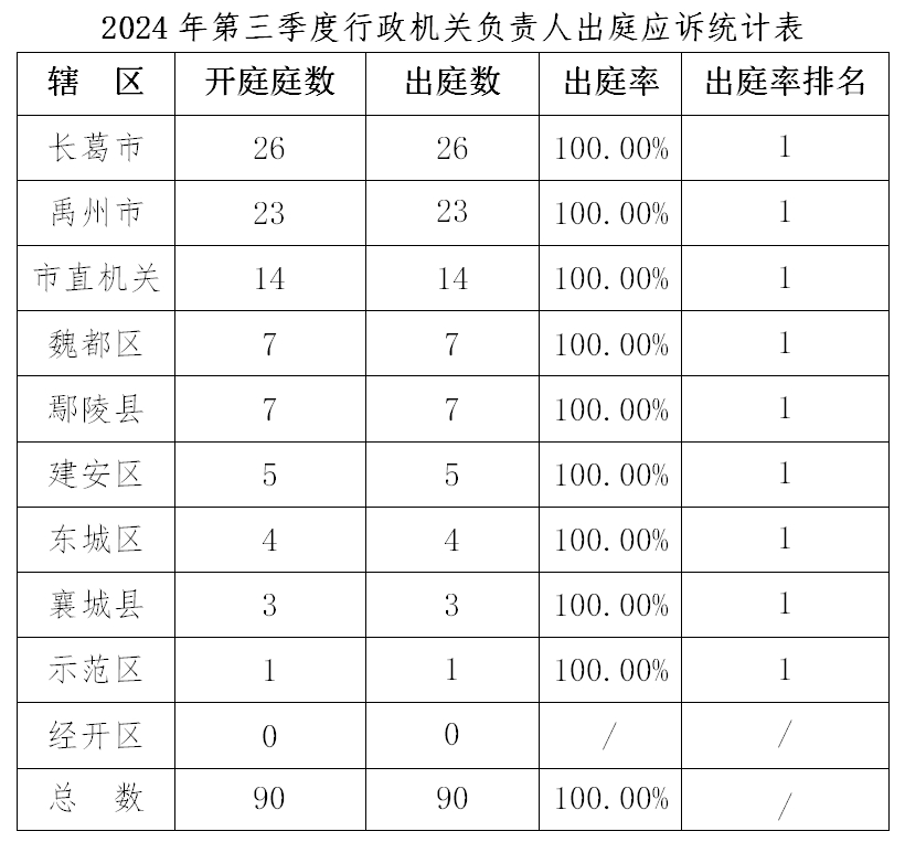 2024年第三季度,市县两级法院开庭审理一审、二审行政案件共90件,出庭90件,行政机关负责人出庭应诉率持续保持100%。