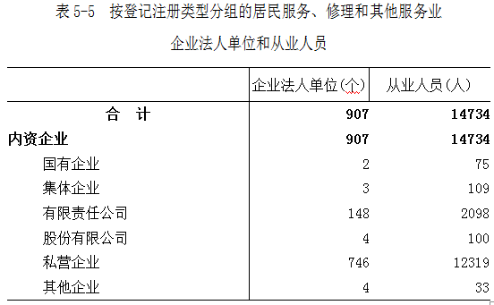 居民服务、修理和其他服务业企业法人单位中,内资企业占100.0%(详见表5-5)。