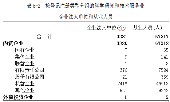 科学研究和技术服务业企业法人单位从业人员中,内资企业占99.99%,外商投资企业占0.01%(详见表5-2)。