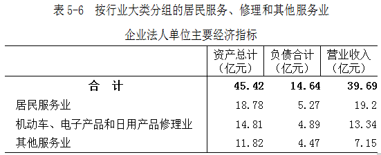 2018年末,居民服务、修理和其他服务业企业法人单位资产总计45.42亿元,比2013年末增长270.7%。负债合计14.64亿元。全年实现营业收入39.69亿元(详见表5-6)。