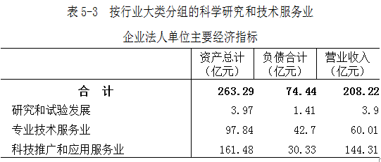 2018年末,科学研究和技术服务业企业法人单位资产总计263.29亿元,比2013年末增长310.6%。负债合计74.44亿元。全年实现营业收入208.22亿元(详见表5-3)。