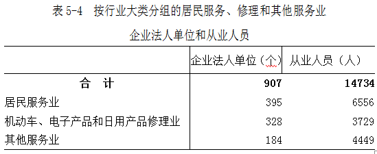 2018年末,全市共有居民服务、修理和其他服务业企业法人单位907个,从业人员1.47万人,分别比2013年末增长308.3%和153.4%(详见表5-4)。