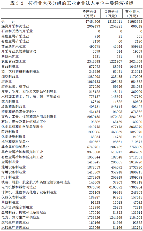 2018年末,工业企业法人单位资产总计4745.43亿元,比2013年末增长36.0%。负债合计1818.34亿元。全年实现营业收入5196.36亿元(详见表3-3)。