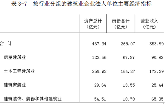 2018年末,建筑业企业法人单位资产总计467.64亿元。负债合计265.07亿元。全年实现营业收入353.99亿元(详见表3-7)。