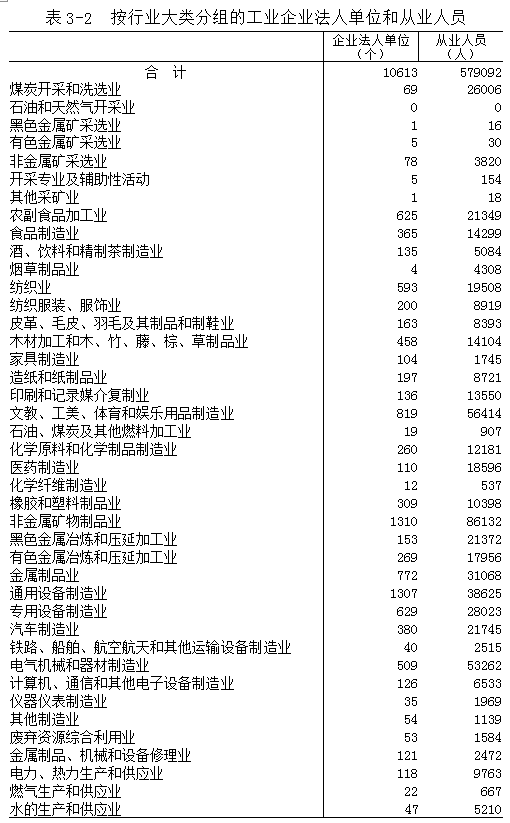 工业企业法人单位从业人员中,采矿业占5.2%,制造业占92.1%,电力、热力、燃气及水生产和供应业占2.7%。工业行业大类中,从业人员数位居前三位的分别是:非金属矿物制品业,占14.9%;文教、工美、体育和娱乐用品制造业,占9.7%;电气机械和器材制造业,占9.2%(详见表3-2)。