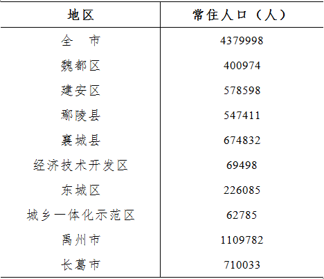 全市常住人口为4379998人,与2010年第六次全国人口普查相比,增加72799人,增长1.69%,年平均增长率为0.17%。