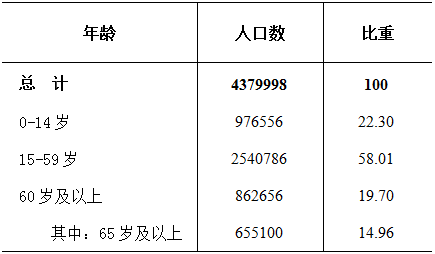 全市常住人口中,0-14岁人口为976556人,占22.30%;15-59岁人口为2540786人,占58.01%;60岁及以上人口为862656人,占19.70%;其中65岁及以上人口为655100人,占14.96%。与2010年第六次全国人口普查相比,0-14岁人口的比重上升2.59个百分点,15-59岁人口的比重下降8.69个百分点,60岁及以上人口的比重上升6.1个百分点,65岁及以上人口的比重上升6.08个百分点。