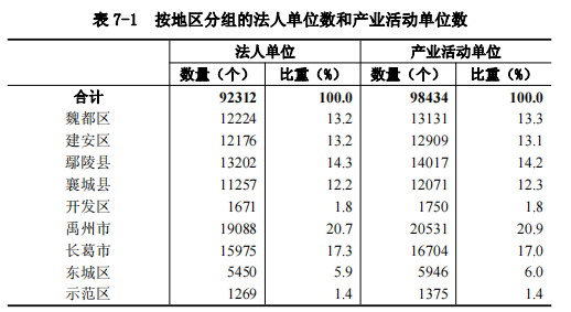 2023年末,全市共有第二产业和第三产业法人单位9.2万个,位居前三位的县(市、区)是:禹州市1.9万个,占20.7%;长葛市1.6万个,占17.3%;鄢陵县1.3万个,占14.3%(详见表7-1)。