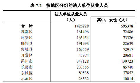 2023年末,全市第二产业和第三产业法人单位从业人员142.5万人,位居前三位的县(市、区)是:禹州市34.8万人,占24.4%;长葛市23.4万人,占16.4%;鄢陵县19.2万人,占13.5%(详见表7-2)。
