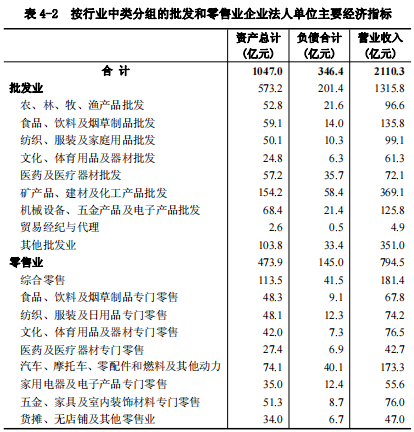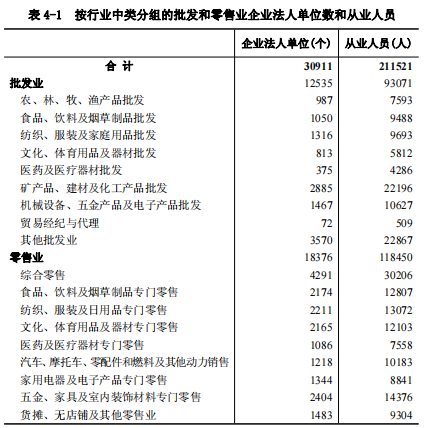 在批发和零售业企业法人单位中,批发业占40.6%,零售业占59.4%。在批发和零售业企业法人单位从业人员中,批发业占44.0%,零售业占56.0%(详见表4-1)。