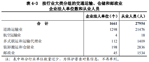 在交通运输、仓储和邮政业企业法人单位中,道路运输业占78.1%,装卸搬运和仓储业占11.9%,多式联运和运输代理业占6.7%,邮政业占2.7%,航空运输业占0.2%。在交通运输、仓储和邮政业企业法人单位从业人员中,道路运输业占76.8%,装卸搬运和仓储业占10.1%,多式联运和运输代理业占5.0%,邮政业占5.5%,航空运输业占0.06%(详见表4-3)。