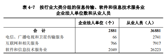 2023年末,全市共有信息传输、软件和信息技术服务业企业法人单位2881个,从业人员3.7万人。