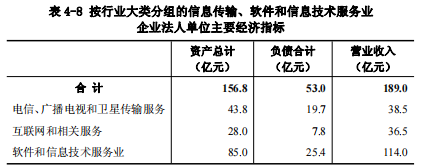 在信息传输、软件和信息技术服务业企业法人单位中,软件和信息技术服务业占71.1%,互联网和相关服务占26.6%,电信、广播电视和卫星传输服务占2.3%。在信息传输、软件和信息技术服务业企业法人单位从业人员中,软件和信息技术服务业占71.1%,互联网和相关服务占21.5%,电信、广播电视和卫星传输服务占7.4%(详见表4-7)。