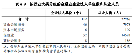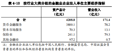 在金融业企业法人单位中,保险业占46.4%,货币金融服务占41.1%,其他金融业占7.1%,资本市场服务占5.4%。在金融业企业法人单位从业人员中,保险业占64.0%,货币金融服务占34.7%,其他金融业占0.8%,资本市场服务占0.5%(详见表4-9)。