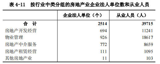 2023年末,全市共有房地产业企业法人单位2514个。其中,房地产开发经营企业694个,物业管理企业926个,房地产中介服务企业772个。