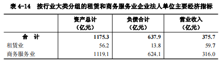 在租赁和商务服务业企业法人单位中,租赁业占15.5%,商务服务业占84.5%。在租赁和商务服务业企业法人单位从业人员中,租赁业占16.6%,商务服务业占83.4%(详见表4-13)。