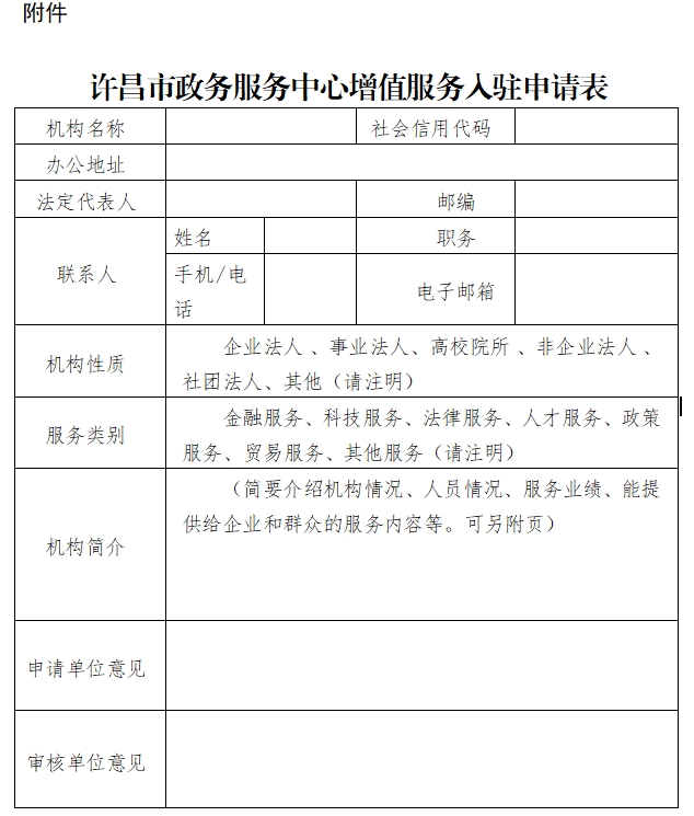 (一)提交申请。有意向的服务机构需填写《世界杯投注政务服务中心增值服务入驻申请表》(详见附件),并提交以下材料: