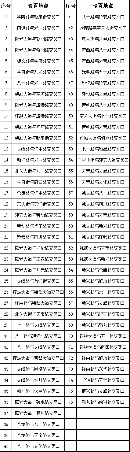 为加强城区交通秩序管理,提高科技管理水平,预防和减少道路交通事故,根据《中华人民共和国道路交通安全法》《河南省道路交通安全条例》等法律法规的规定,在我市城区更新、补建电子执法取证设备76处,现予以公示: