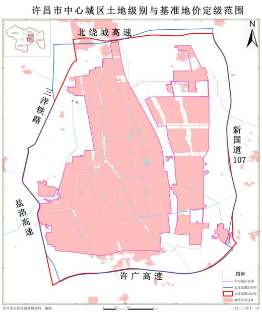 2023年11月,根据《河南省自然资源厅办公室关于开展城镇土地级别与基准地价更新调整工作的通知》及《河南省城镇土地级别与基准地价更新调整技术方案》要求,拟定我市地价更新调整工作方案和技术方案。2023年11月-2024年1月,通过收集18个行业部门的基准资料、定级资料、估价资料和各要素点现场实地调研,搭建了定级指标体系及权重,开展级别划分和基准地价评估,形成初步成果。2024年1月-2024年3月,成果完成向社会公开征求意见、专家论证、风险评估、合法性审查等工作。2024年4月,通过《世界杯投注fifa官方网关于公布世界杯投注网站中心城区城镇土地级别与基准地价更新调整成果的通知》(许政〔2024〕8号)公布实施。