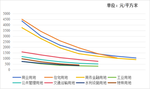 商业和住宅用地价格总体较高,商务金融价格低于商业和住宅,其他五类用地价格较低,工矿仓储和水利用地价格最低。