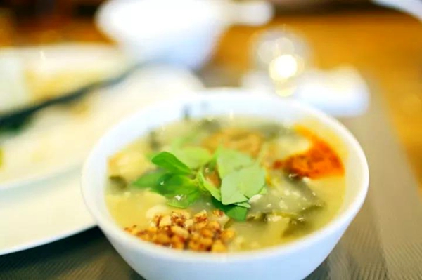 鄢陵大豆腐脑儿的基本形状是黏黏稠稠的,凝结成块的豆腐脑裹挟着黑菜或青菜之类的菜叶,看上去好像是熬了一锅咸糊涂。有人来吃时,摊主就会用勺子盛入碗中,淋上几滴香油和芝麻酱,放几颗煮熟腌好的黄豆粒,再配以绿色芹菜丁,色香十分诱人。汤是黏黏的、酸酸的且有点煳嘴,豆腐脑嚼起来筋道香甜,后味无穷。
