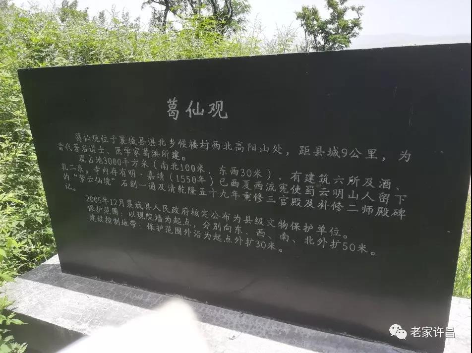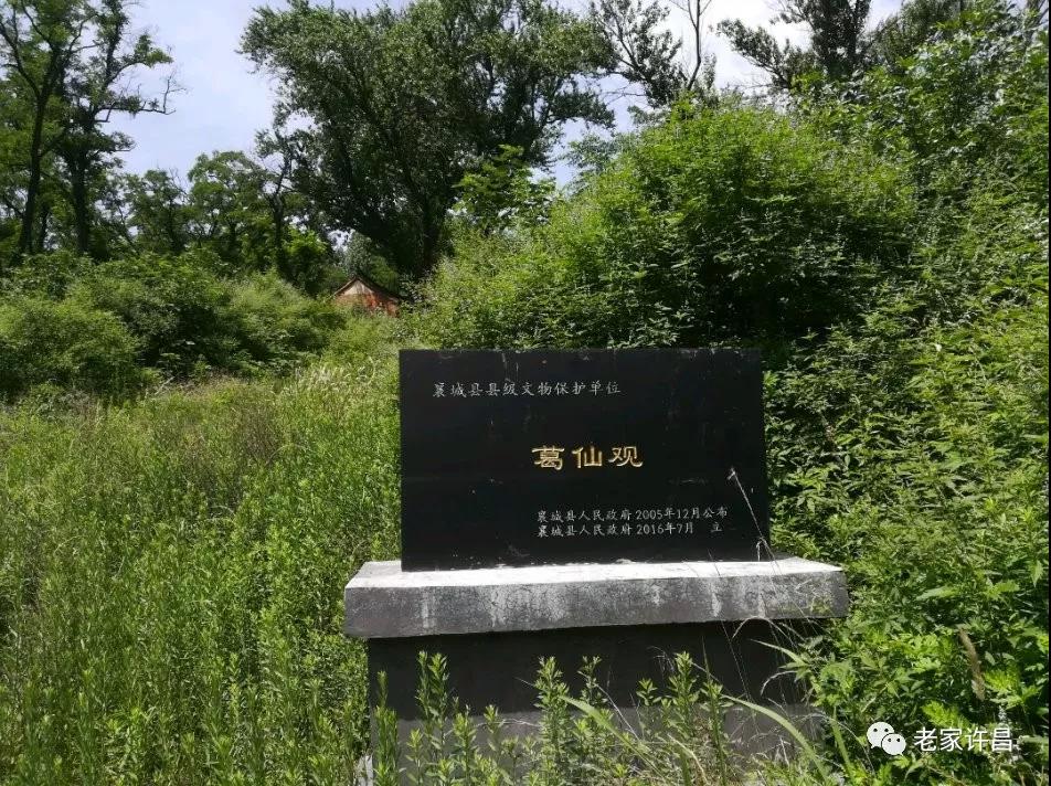 葛仙观位于湛北乡侯楼村西南的焦赞、孟良山中部东麓,距襄城县城南约9公里,离古官道约1公里。焦赞、孟良山又叫仙翁山。据民国二十五年《重修襄城县志》载:“迴出群峰,登山之南颠,俯看沙湛,远眺宛叶,实襄邑山之最高者。上有葛仙翁观,丹井依然,乃晋葛玄之迹也。二泉仅隔五尺许,一泉取水,二泉皆动,然珠色异味,殆不可解。”这是襄城县文物保护部门树立的保护标志。