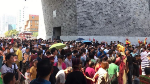 演出结束的魏王曹操顿时被潮水一般的游客包围了……潮水般的游客涌向曹魏古城南大街。