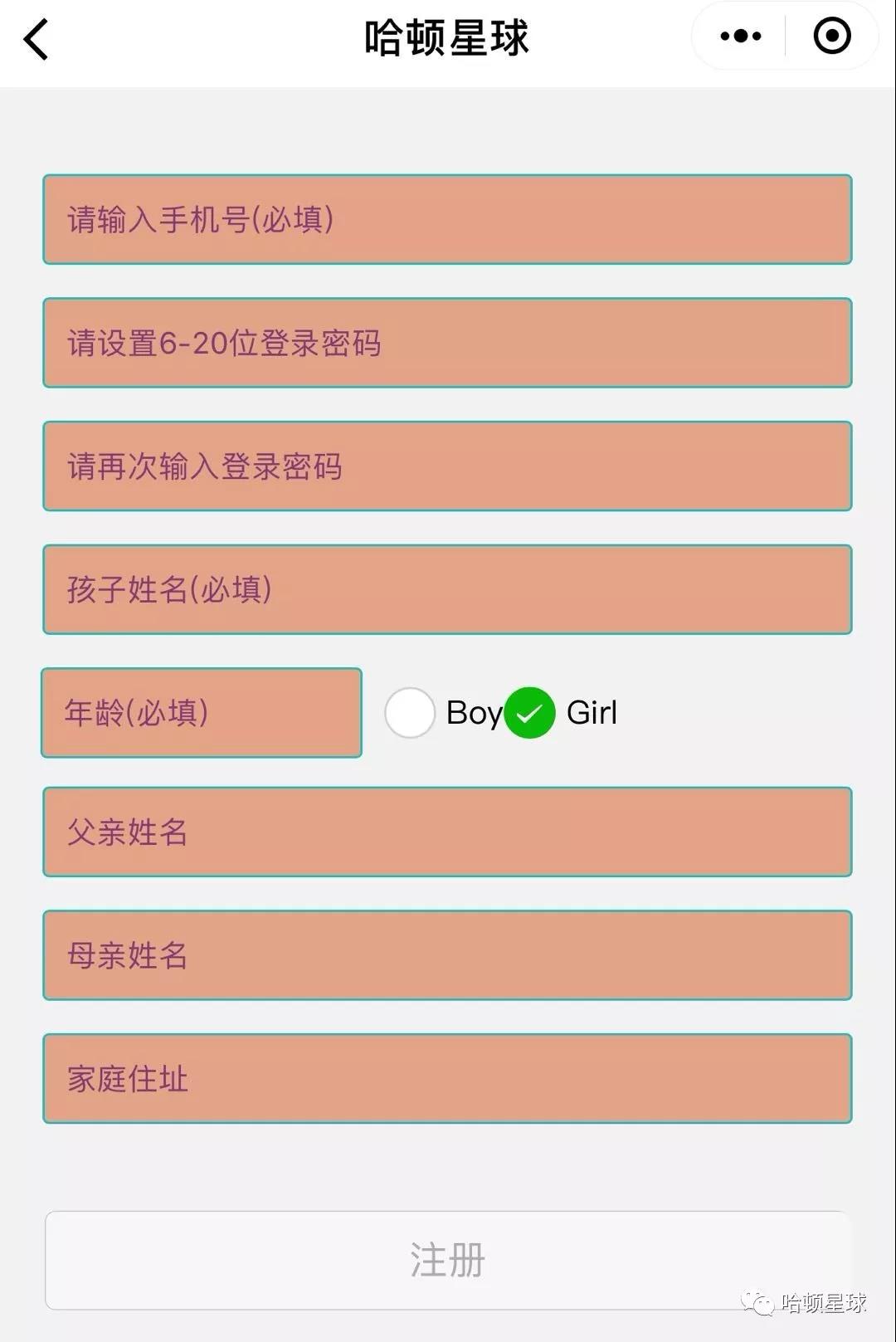 1.关注公众号后,首先点击注册信息,填写孩子个人信息