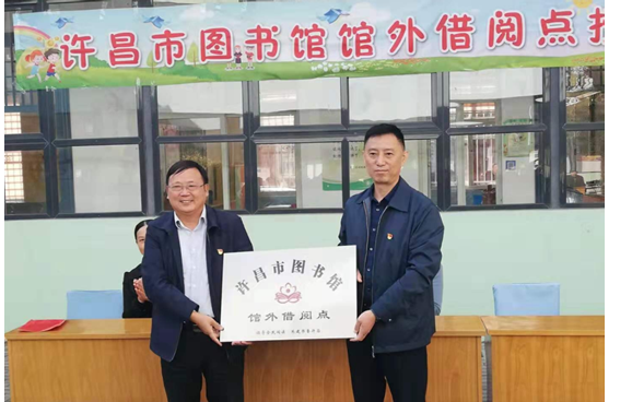 世界杯投注图书馆馆长安玉龙向世界杯投注特殊教育学校校长郑春六授牌