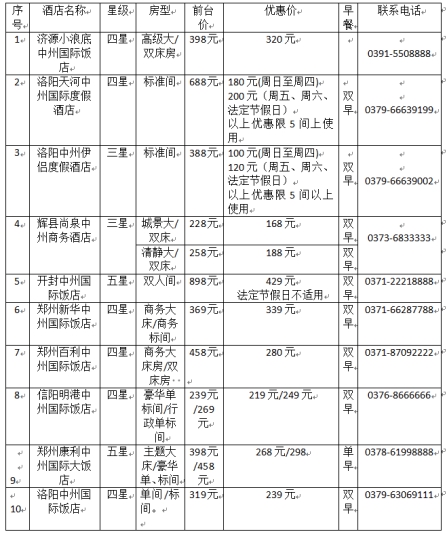 中汇大酒店:三星级,普通标间原价188元/天,优惠价168元/天,豪华标间原价198元/天,优惠价188元/天,单间218元/天,优惠价198元/天,套房488元/天,优惠价428元/天,咨询电话:0394-6238888。(满10间以上享受优惠,春节期间不享受此优惠)