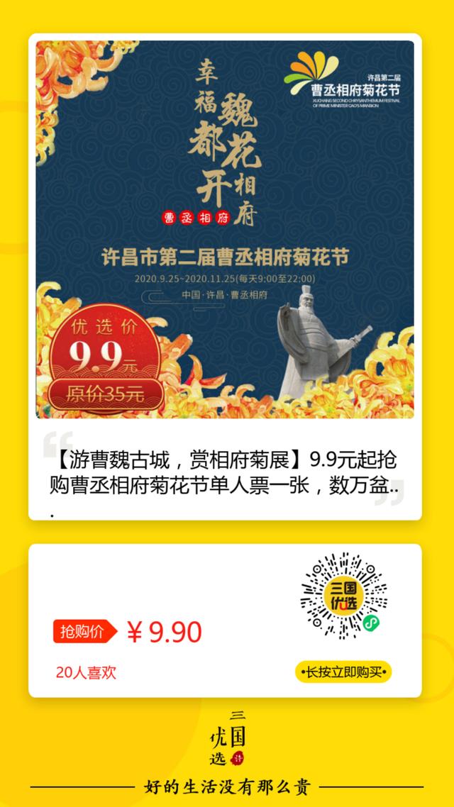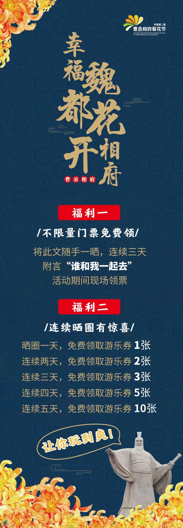快约起小伙伴,一起走进曹丞相府,赴一场绚烂的菊花盛宴吧 !土豪抢票链接!数量有限,先到先得。