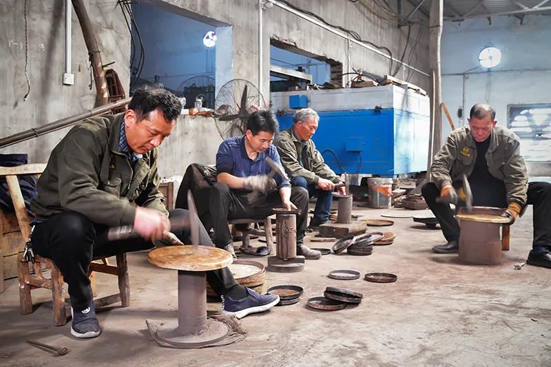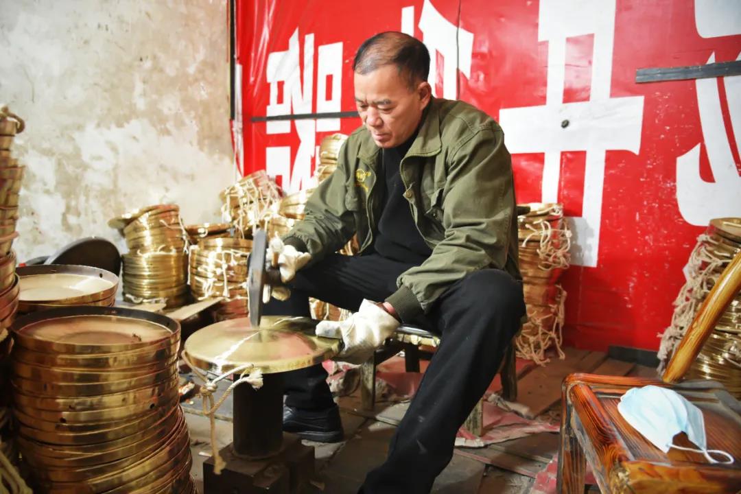其以红铜为主料,配以一定比例锡,有熔铜、注模、打坨、定型、淬火、修容、定音等工序。以多人默契配合打坨,以淬火提高柔韧性,还要边剪齐、面锤平、型锤圆、片旋净,最终达到纹理细腻、利于握持的效果。产品以各种型号锣铙钹镲为主,其锣圆润悠长,其镲清脆悦耳,广泛用于传统戏剧、曲艺、音乐、舞蹈及宗教仪式、节庆节日等场合。