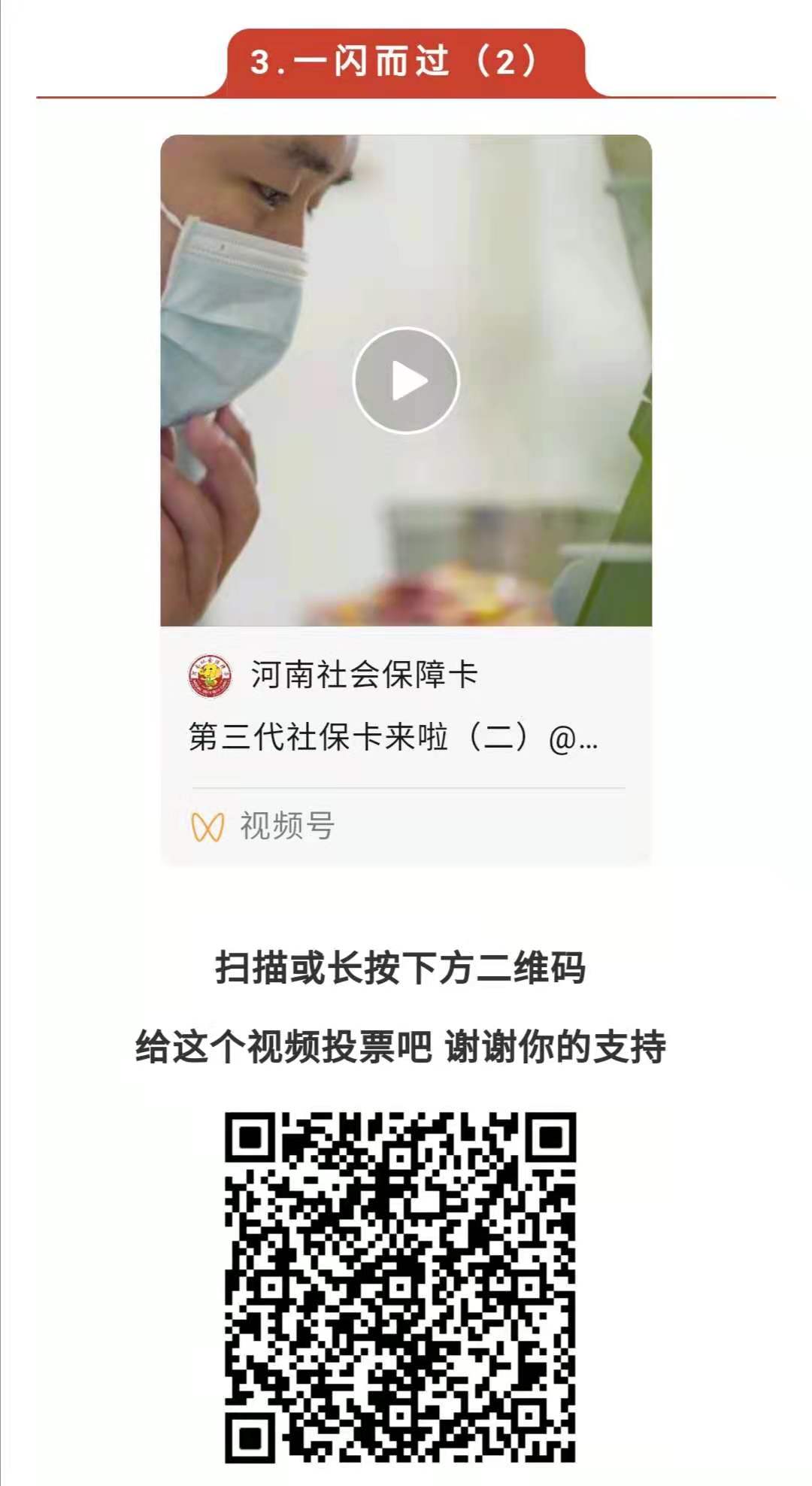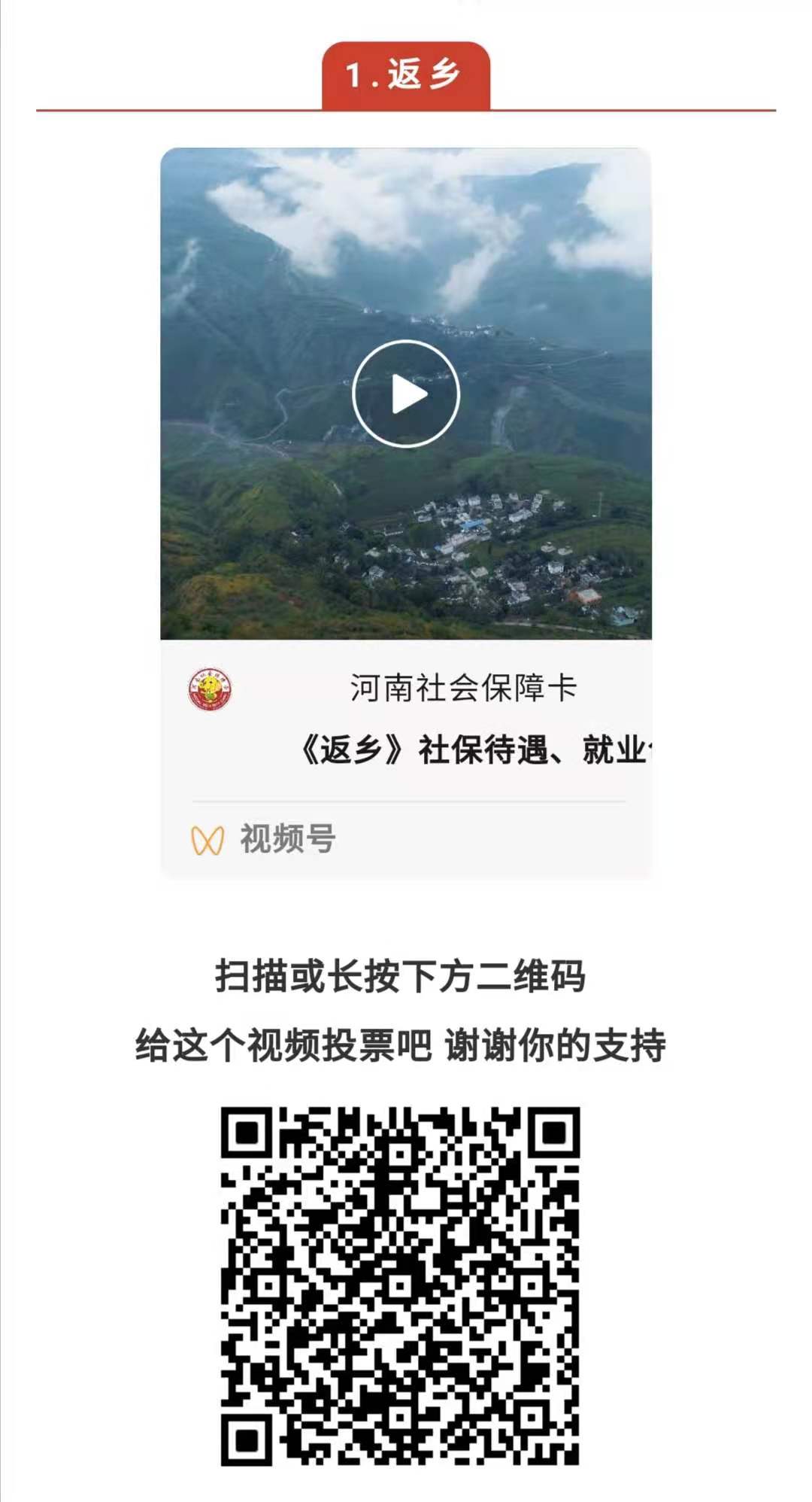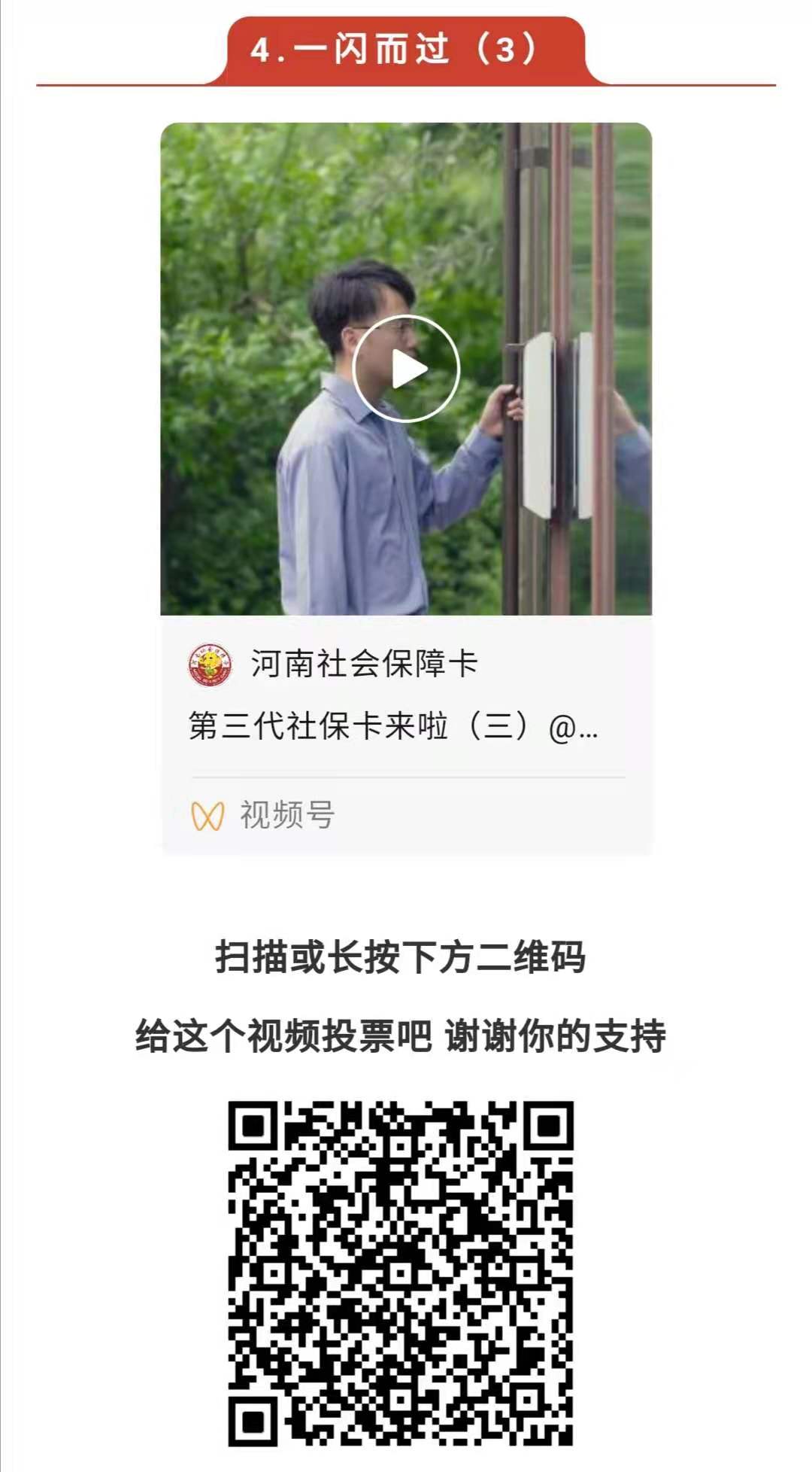 号外,号外!由中央政法委举办的第六届平安中国“三微”比赛央视频展映展播投票H5已经上线,河南省人力资源和社会保障厅制作的河南社会保障卡主题微视频《返乡》、《一闪而过》(系列)等作品成功入围!