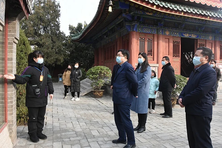 赵鹏一行来到曹魏古城,听取曹魏古城建设运营情况汇报,查看沿街商户经营、三国文化特色商品售卖、元宵节文化活动开展及疫情防控等情况;在春秋楼景区和曹丞相府景区,赵鹏听取建设运营情况汇报,实地察看三国文化资源保护开发利用情况,并聆听曹操、关羽等三国人物有关的典故挖掘和展示情况讲解,到春秋楼文庙了解文物保护和文化遗产传承弘扬情况;在灞陵桥景区,赵鹏一行听取景区元宵节期间文化活动筹备开展情况汇报,了解安全预案准备和疫情防控措施落实情况,驻足观看舞狮等民俗文化表演,与饮食摊点商户交流,了解特色饮食销售情况。