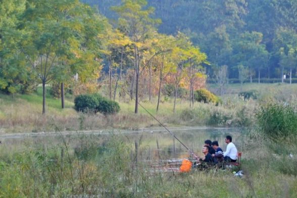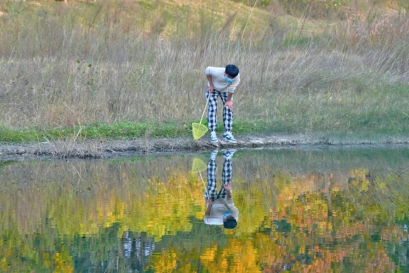 一湾秋水一抹金黄,男孩矗立河边认真欣赏秋色。