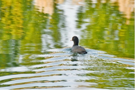 蒲苇丛里游出一只野鸭,平静的水面顿时微波粼粼。