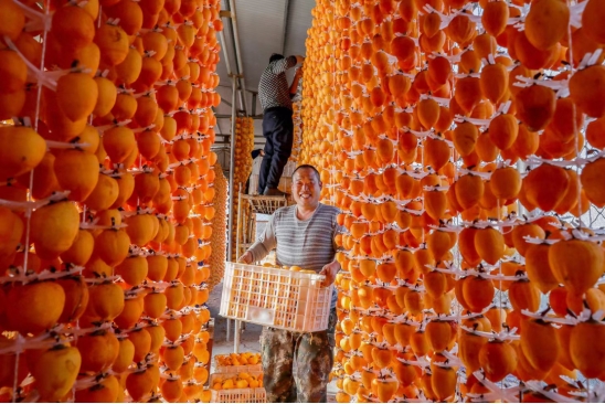 刘门村的柿饼加工和柿子醋制作工艺已非常成熟,产品不仅形成了规模,而且还做响了品牌。每年的霜降前一个月是尖柿的快速澎涨期,霜降后一周内采摘完毕,再经过筛选、折挂钩、削皮、架挂、捏心、下架、出水、潮霜等工序制成柿饼。