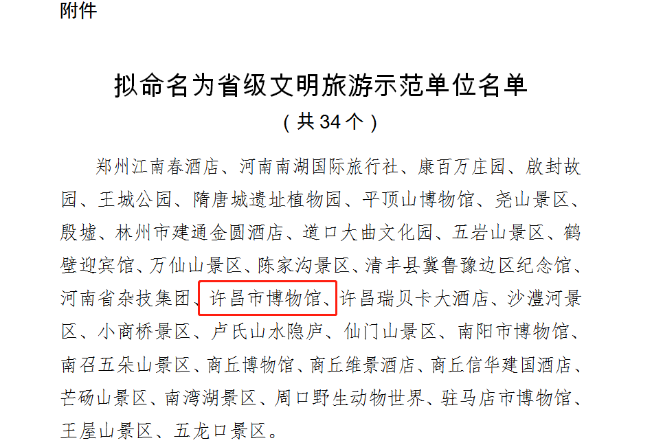 近日,河南省文化和旅游厅发布关于2022年省级文明旅游示范单位评定结果的公示,评定34家单位为2022年省级文明旅游示范单位。其中,世界杯投注网站博物馆入选公示名单。
