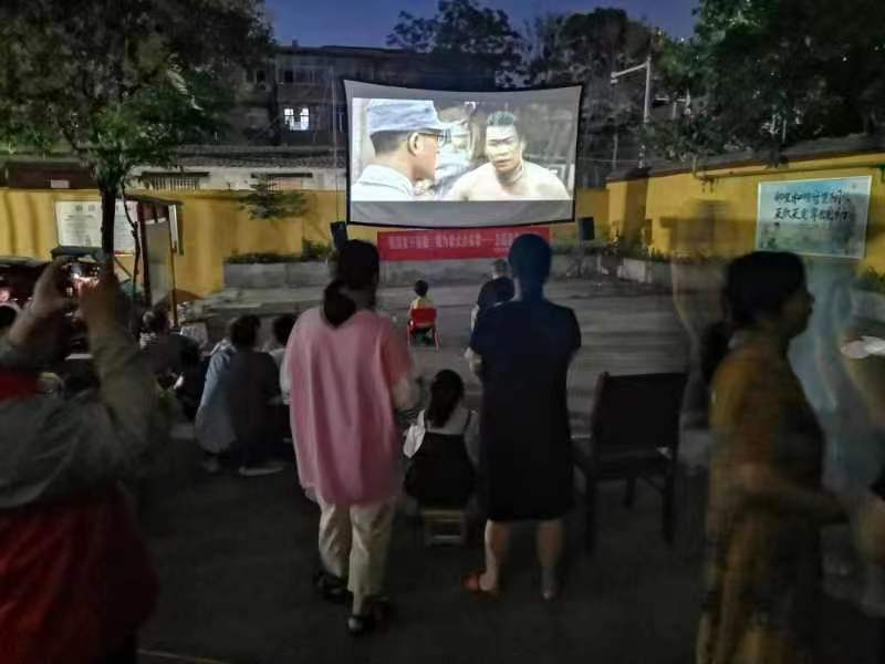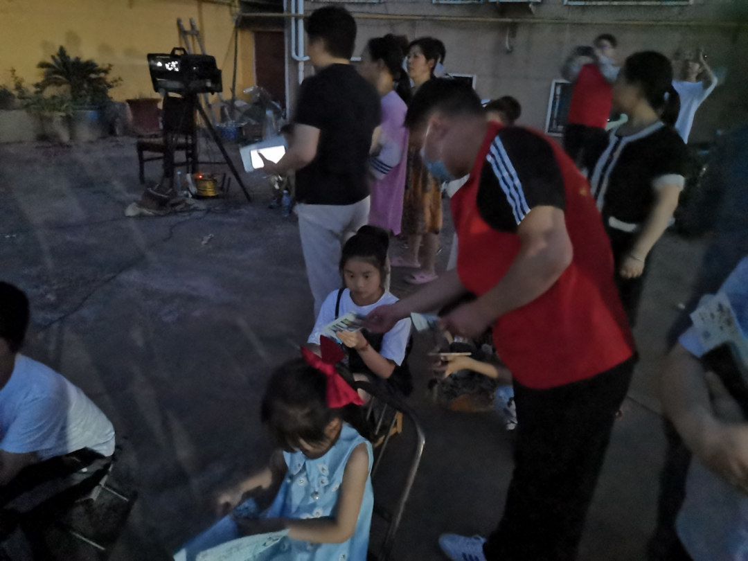 20时许,小区及周边群众陆续来到放映场,科教片《电瓶车安全小故事》、爱国主义教育片《宋庄战斗》相继上映。随着电影播放的进行,周边群众骑着电瓶车、三轮车等前来观影,晚上下班回来的群众到放映场自觉停下脚步,加入观影行列。文旅志愿者穿梭于观众之间,发放宣传彩页,为老弱群众送上矿泉水消暑解渴。送电影进小区活动,丰富了小区群众文化生活,为小区邻里交流提供了良好平台,进一步提升帮扶小区的文明水平,深受帮扶小区及周边群众喜欢。