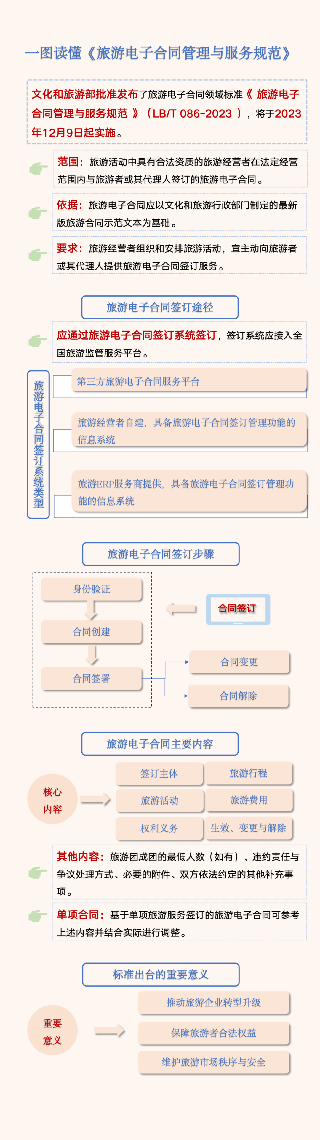近日,文化和旅游部批准发布了旅游电子合同领域的行业标准《旅游电子合同管理与服务规范》(以下简称“标准”),将于2023年12月9日起实施。伴随网络信息技术的普及应用,通过电子方式签署旅游合同已经成为旅游企业和旅游者的主要选择。旅游电子合同作为保障服务质量和规范经营行为的重要载体,其合法性、便捷性、高效性优势日益凸显,与市场秩序和旅游者权益紧密相关。