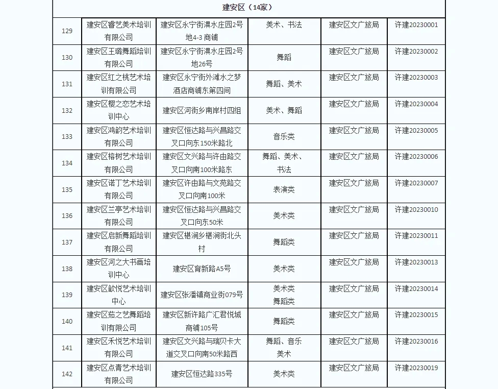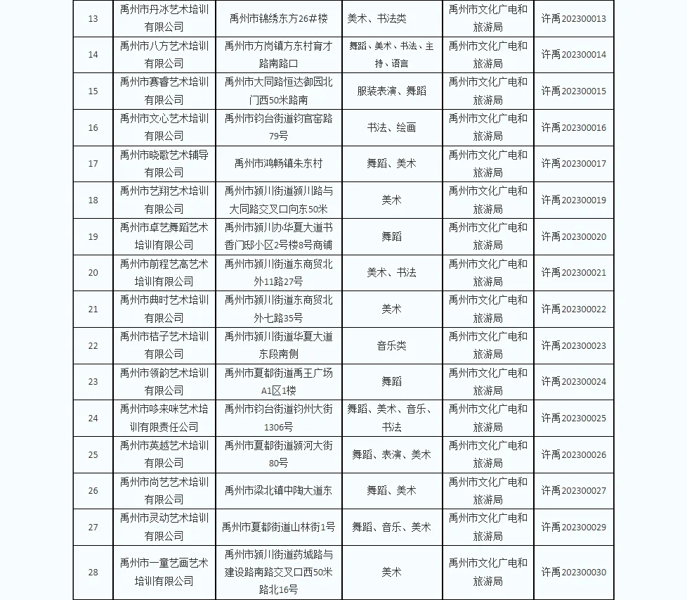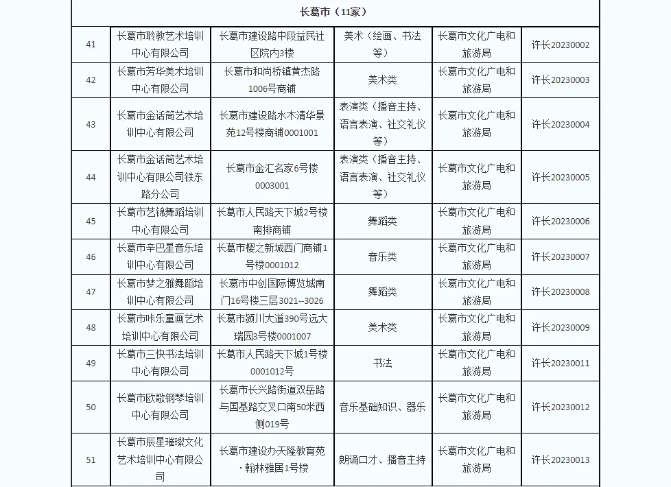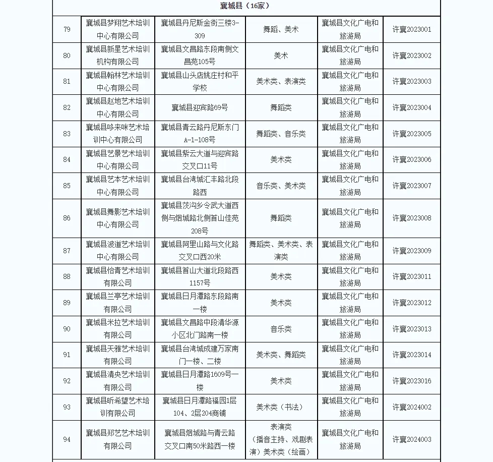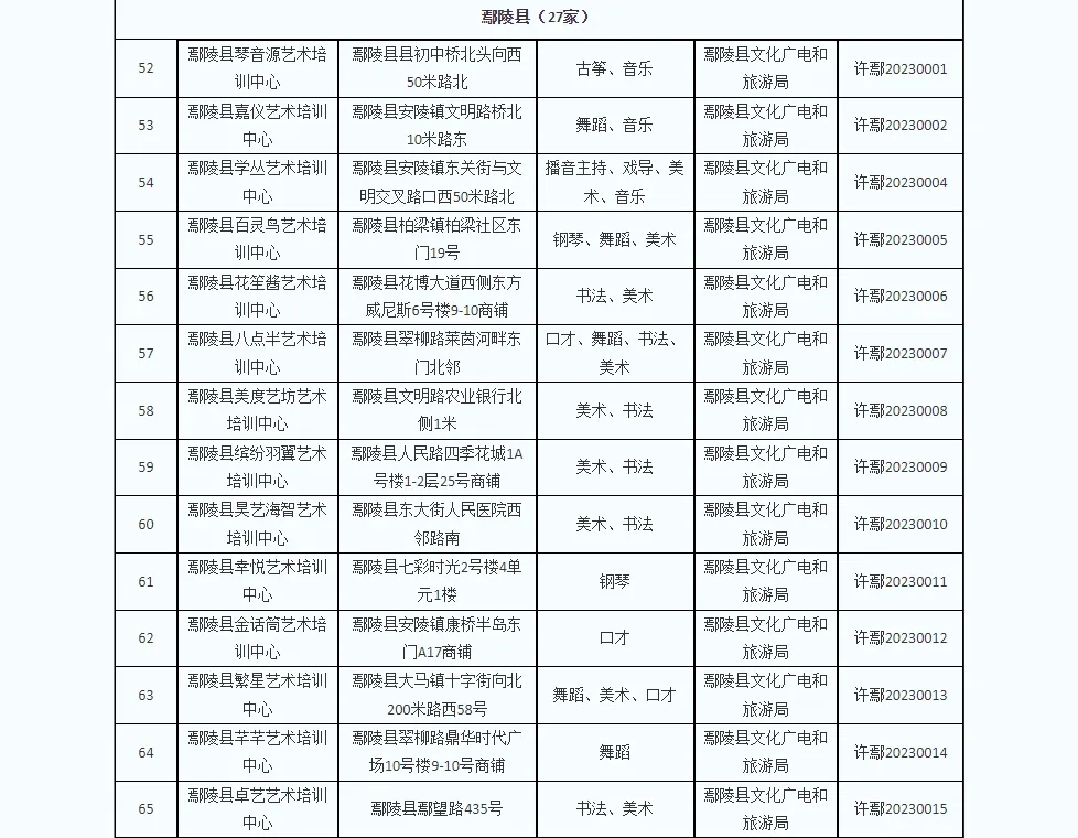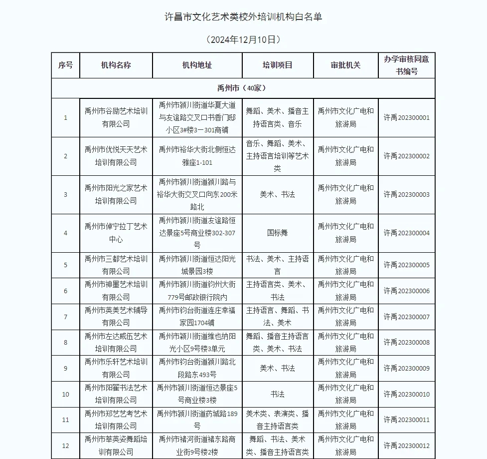 为推进文化艺术类校外培训机构参与义务教育学校课后服务工作,同时为方便广大学生家长选择合规合法培训机构,现对全市现有文化艺术类校外培训白名单机构予以重新公布。截止2024年12月10日,经各县(市、区)文化广电旅游部门确认,全市176家机构取得了文化艺术类校外培训机构《办学审核同意书》,并在此提醒家长和学生不要到无证培训机构进行培训,切实维护自身利益。(名单附后)