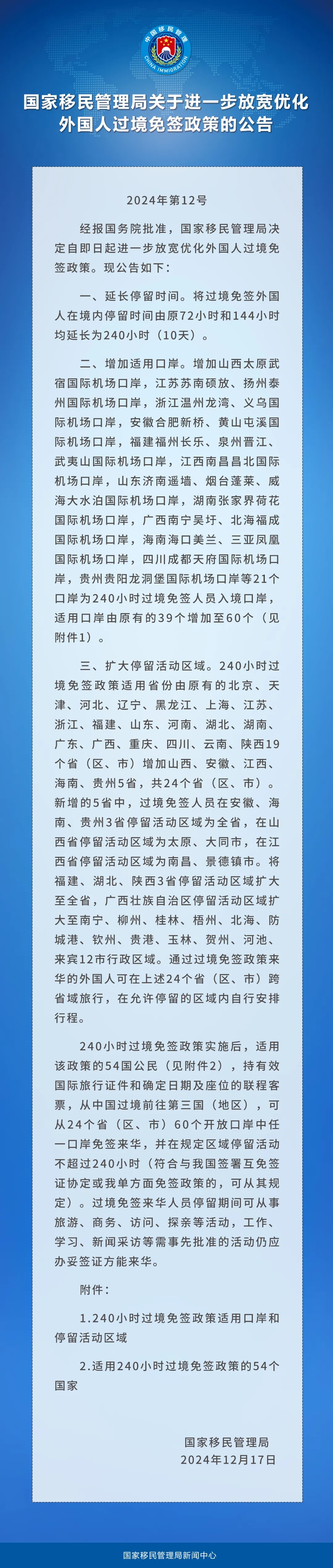 国家移民管理局关于进一步放宽优化外国人过境免签政策的公告