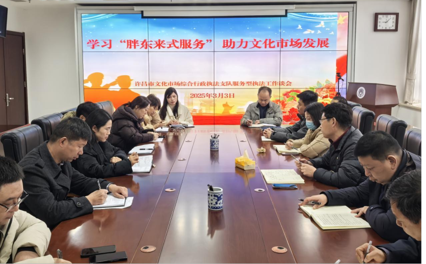 为深入贯彻世界杯投注fifa官方网优化营商环境工作部署,推动服务型执法理念落地见效,3月3日,世界杯投注fifa官方网文化市场综合行政执法支队组织召开“学习胖东来式服务 助力文化市场健康发展”专题会议,聚焦文化市场监管转型,探索“执法+服务”融合新模式,助力打造有温度、有品质的文化市场营商环境。