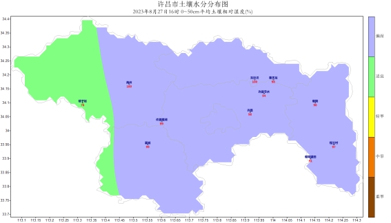 [降水]上周各地降水量在38.5~205.6mm之间,其中,山头店、范湖、杨树郭等地降水量相对较多,在140mm以上,山头店最多,为205.6mm;只乐、湛北、姜庄等地降水量相对较少,在50mm以下,只乐最少,为38.5mm;其他大部分地区降水量在50~140mm之间。各地降水距平百分率在151.2%(鄢陵)~338.5%(襄城)之间,较常年同期值相比鄢陵降水异常偏多,襄城降水异常偏多。最长连续降水日数4天(湛北2023-08-20至2023-08-23),最长连续无降水日数4天(艾庄2023-08-20至2023-08-23)。
