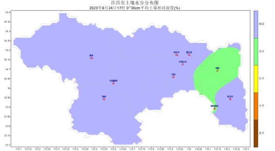 [降水]上周各地降水量在37.6~143.1mm之间,其中,屯沟、望田、陶城等地降水量相对较多,在130mm以上,屯沟最多,为143.1mm;神垕、姜庄、浅井等地降水量相对较少,在55mm以下,神垕最少,为37.6mm;其他大部分地区降水量在55~130mm之间。各地降水距平百分率在284.1%(长葛)~483.4%(禹州)之间,较常年同期值相比长葛降水异常偏多,禹州降水异常偏多。最长连续降水日数7天(古城2023-09-17至2023-09-23),最长连续无降水日数4天(神垕2023-09-20至2023-09-23)。