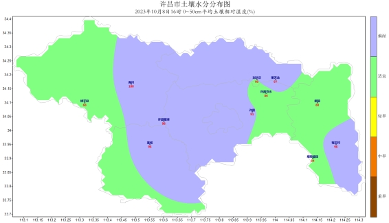 [降水]上周各地降水量在5.2~22.8mm之间,其中,韩外、山头店、大鸿寨等地降水量在20mm以上,韩外最多,为22.8mm;范湖、南席、董村等地降水量在10mm以下,范湖最少,为5.2mm;其他大部分地区降水量在10.0~20.0mm之间。各地降水距平百分率在-47.0%(长葛)~13.3%(襄城)之间,较常年同期值相比长葛降水明显偏少,襄城降水明显偏多。最长连续降水日数7天(大马2023-10-01至2023-10-07),最长连续无降水日数3天(寺郭2023-10-01至2023-10-03)。